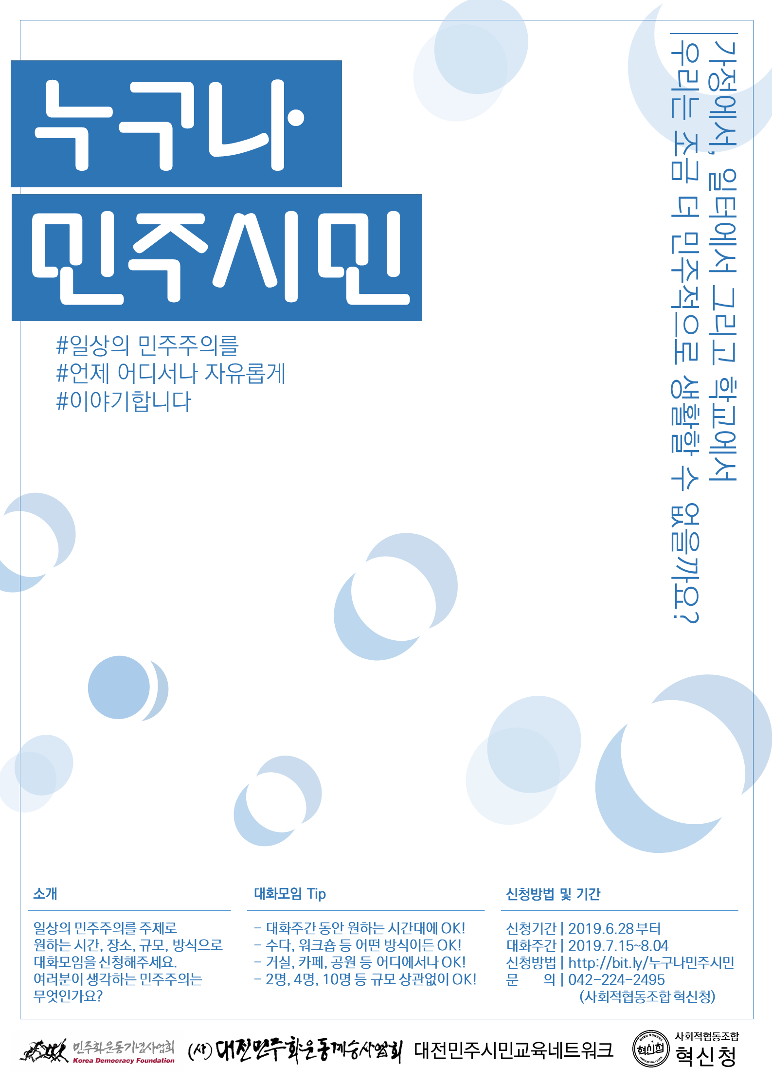 ○ 행사명 : 누구나정상회담 @민주시민 <누구나 민주시민-참가신청> ○ 일시 : 신청기간 : 2019.6.28(금) 부터 대화주간 : 2019.7.15(월) ~ 8.04(일) ○ 장소 : 지역 곳곳 어디에서나 가능 ○ 신청방법 : http://bit.ly/누구나민주시민, 전화신청가능 ○ 문의 : 사회적협동조합 혁신청 042)224-2495