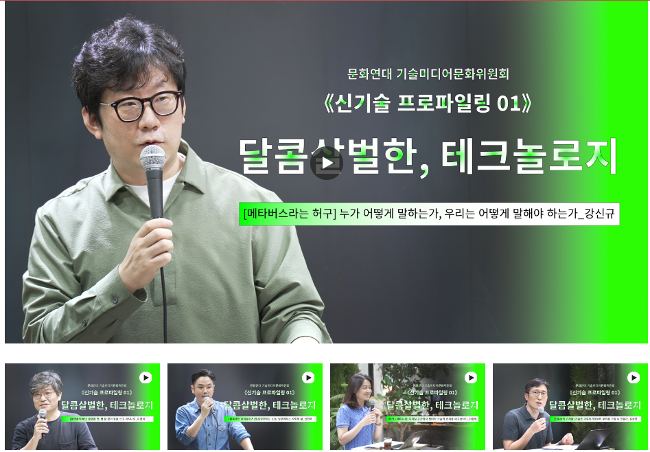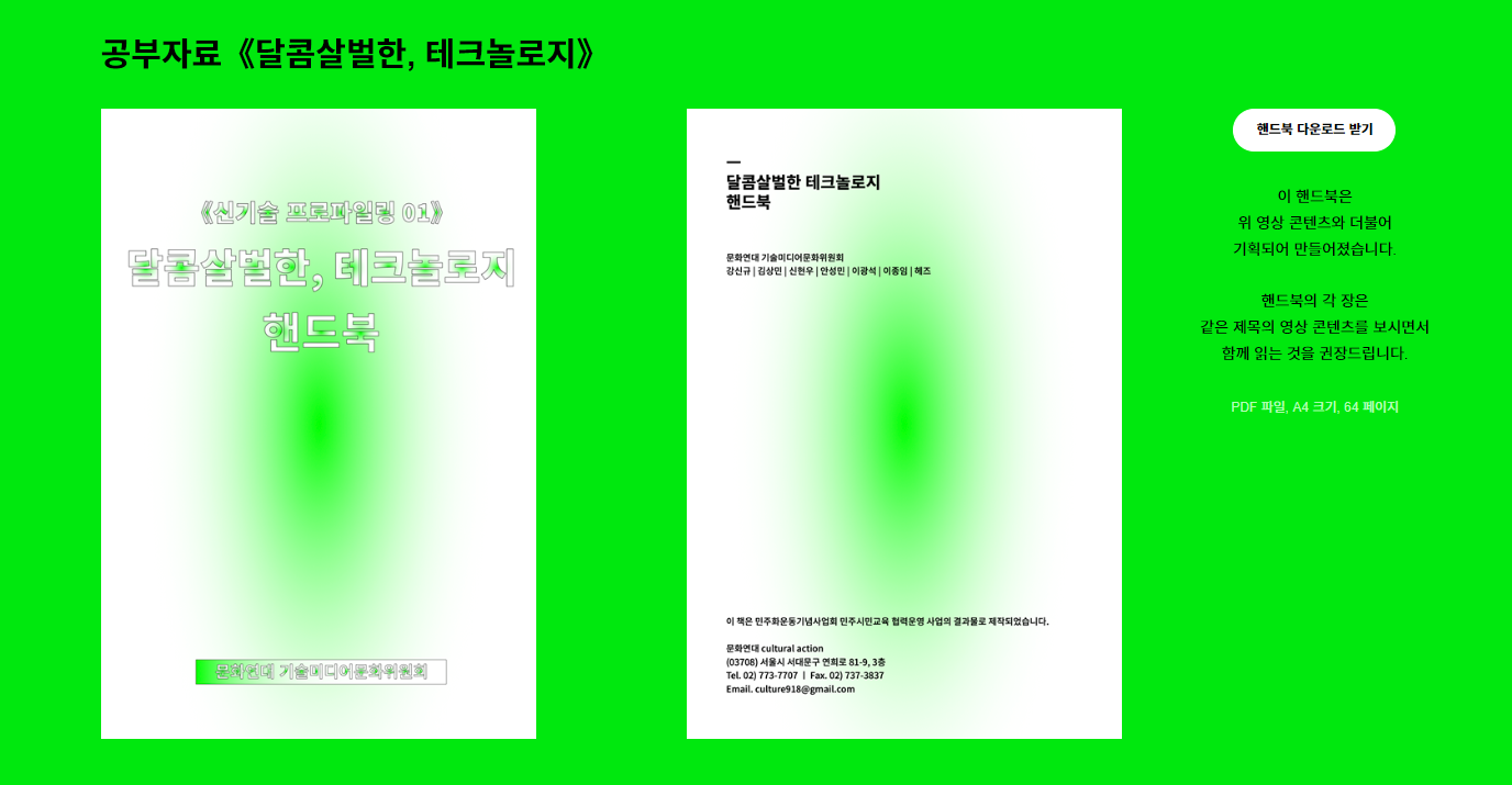 신기술 프로파일링 <달콤살벌한 테크놀로지> 시민 교육 툴킷<신기술 프로파일링> 웹페이지 바로가기 클릭달콤살벌한 테크놀로지 강의 시리즈 바로가기 클릭소책자 다운로드 행사 정보 월요일 2022-10-31 문화연대 지도에서 보기