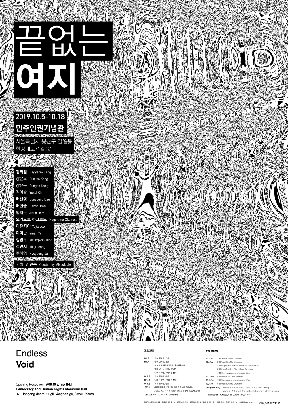 <끝없는 여지(Endless Void)> 전에 참여한 13명의 청년작가들은 옛 남영동 대공분실이 민주인권기념관으로 재탄생하기 이전, 그 사이의 공간과 시간대로 걸어 들어가 기억의 (불)가능성을 확인했습니다. 그러나 여기서 벌어진 일들에 대해 과거의 것, 타인의 고통, 당사자들만의 문제라며 근엄하게 선을 긋는 이들을 향해, 그것은 상상할 수 있는 일, 사람이 저지른 일, 당사자가 아니라 타인이 기억해줘야 할 일이라고 말합니다.